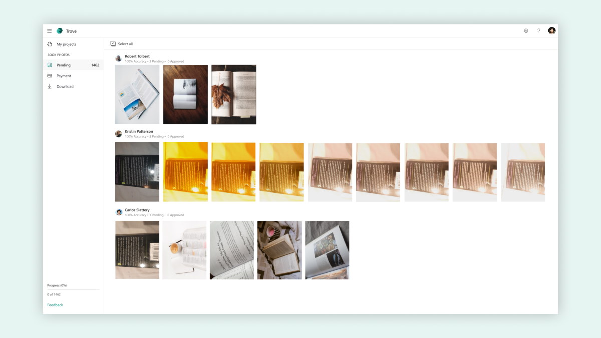 Instead of downloading separate batches of photos from different submitters, Trove will now let you download all photos you have purchased for your project at once in a single zip file.