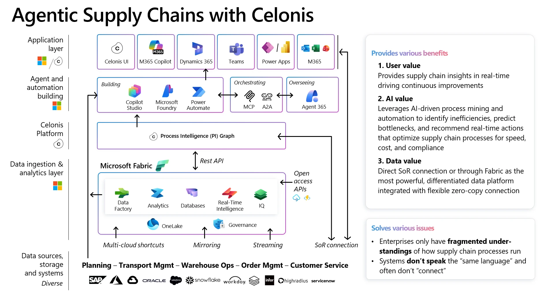 On the System of Record (SoR) layer, data is often siloed and does not “speak the same language,” leading to a fragmented understanding within the supply chain. Microsoft Fabric unifies this data through mirroring, streaming, or multi-cloud shortcuts with the goal to create a zero-copy connection and ensure the data is fresh and accessible without the weight of traditional extract, transform, and load (ETL) processes. Fabric IQ provides a reasoning layer that translates raw, unified data in OneLake into context-aware insights. This is the basis for Celonis’ Process Intelligence (PI) Graph which sits between data and the automation and uses process mining to map out how the supply chain actually runs—generating operational supply chain insights and suggesting improvement potentials from a process point of view. It communicates with Microsoft Fabric through Rest APIs, providing the knowledge and context that AI needs to make sense of the data. The agentic layer is divided into three functions: