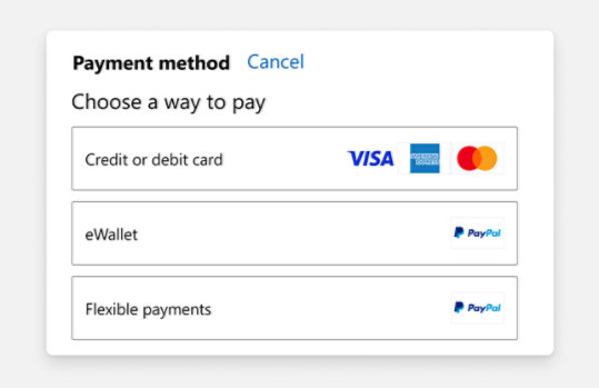 PayPal Pay in 4 can be used for gift cards, but not for one-time paid or recurring subscriptions at Microsoft Store.