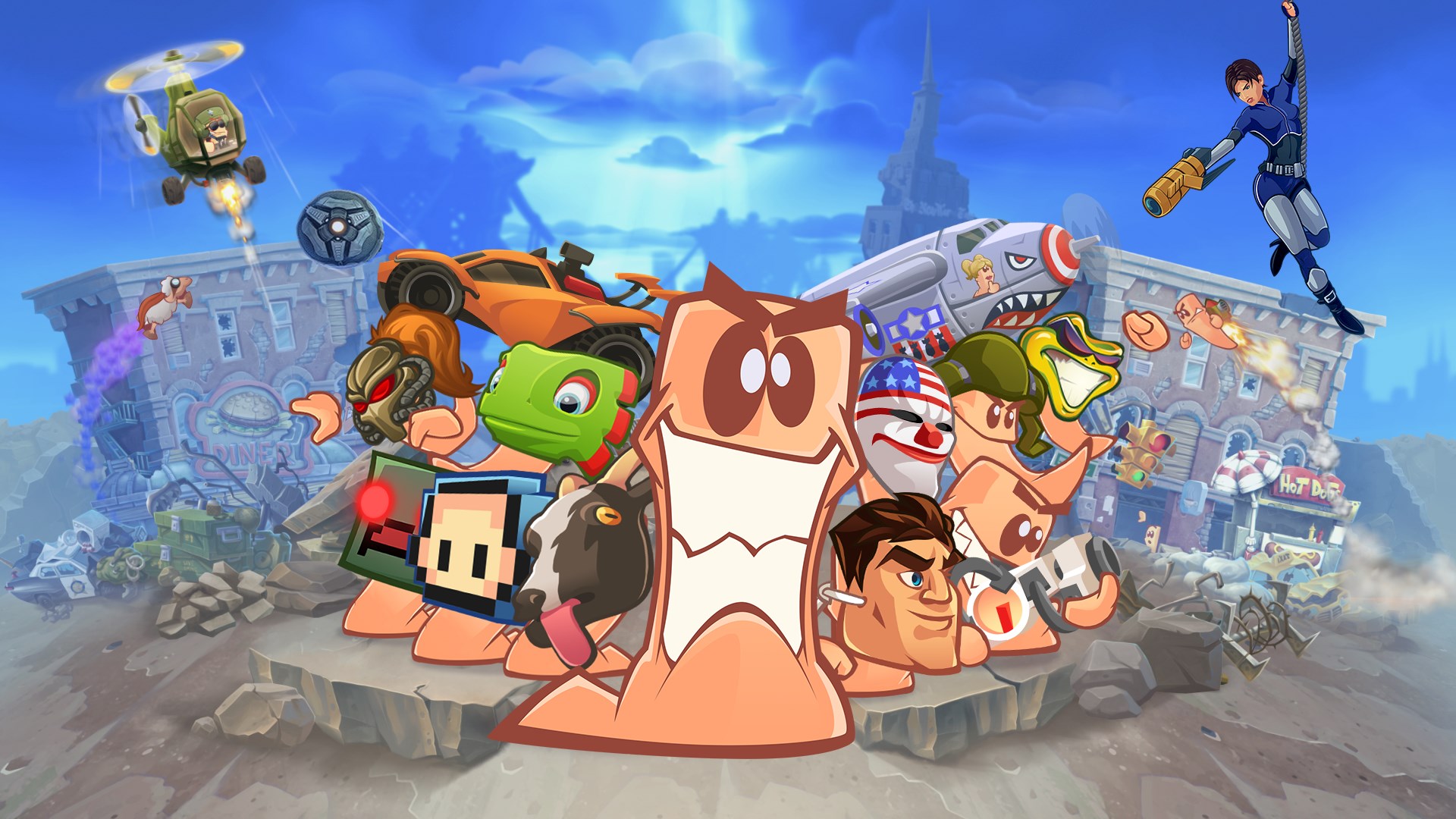 In Worms W.M.D, the worms are back in their most destructive game yet. With a gorgeous, hand-drawn 2D look, brand new weapons, the introduction of crafting, vehicles and buildings plus the return of some much-loved classic weapons and gameplay, Worms W.M.D is the best worms experience ever. Work your way through 30 campaign levels of increasing difficulty using the huge arsenal of new and classic weapons at your disposal. Use new vehicles to cause chaos amongst the enemy ranks and use buildings to gain the tactical advantage as you try to dominate the battlefield! Take on up to five opponents in hilarious all-out tactical worm warfare with up to eight worms each, either in local or online multiplayer, including ranked play. With 80 weapons and utilities at your fingertips, this is Worms at its chaotic best! Available until September 6th, this Edition of Worms W.M.D includes the Worms W.M.D All-Stars Pack, featuring an army of guest stars from some of the hottest games around! Exclusive to Xbox One players is the Rare All-Stars content with some of the most famous characters from the legendary developer joining the carnage! Rare All-Stars - Unleash the devastating Joanna Dark from Perfect Dark on your enemies and send your worms into battle with an exclusive five-mask set (Blast Corps, Jet Force Gemini, Jetpac, Killer Instinct and Battletoads). Goat Simulator - Use the Goat-on-a-Rope weapon to strike fear into the hearts of your enemies as the goat swings around the gorgeous digitally painted 2D landscapes using its sticky tongue to hone in on them! We also have a pretty cool Goat Simulator three mask set. Because, why not? Broforce - Coming to the explosive rescue of worms everywhere is the fan favourite ‘Broforce Turkey Bomb’, bringing the pain in Worms W.M.D. And that’s not all. “Freedom Strike” – a Broforce flavoured airstrike - will rain down fiery hell from the skies. Booyah! Saints Row IV - Saints Row, the most outrageous, over-the-top action franchise in videogames, arrives in Worms W.M.D in the form of the Dubstep gun from Saints Row IV, bringing the dance-pocalypse as one of the game’s mounted guns. The Escapists - A three masks set from the award winning 2015 hit The Escapists is a must-have accessory for all wormy wannabe escapists. And if you want somewhere different to escape to, the new ‘The Escapists’ mission is waiting for you. Rocket League - Worms fans worldwide are eager to cause mayhem with the all-new, mega powerful Tank in Worms W.M.D. But wait until they get their hands on the Classic Rocket League Car! Soccer meets Driving meets Worms. What's not to like? Orcs Must Die - The War Mage and Sorceress have vowed to protect the world and guard the rifts. But sometime after the last great battle, trouble is brewing again. Whilst we wait for the Orc Invasion, we can dress our Worms up in this Orcs Must Die! three mask set and use the excellent Orcs Must Die! crafted weapon. Yooka-Laylee - Dress your Worms up as one of the year's most anticipated double acts with the crazy Yooka-Laylee seven mask set. Unturned - The free-to-play Zombie Survival Sensation, where millions of users try their best to stay alive shuffles into Worms W.M.D in search of brains! And in homage to this popular zomb-fest, Worms fans can dress their worms in a three mask set and wage war in an Unturned Mission. Payday 2 - It’s Payday time for the Worms. Stick it to the man by dressing your invertebrate chums up in the masks that have become iconic for millions of Payday fans around the world and plan your attack looking like a total badass. They’ll never take you alive! Classic Worms - Ahhhh, precious memories of mutually-assured worm destruction! Don’t you just wish you could re-live them, for just one day? We’ve got you covered! Unleash the Ming Vase, Sheep Launcher and Kamikaze weapons get stuck into five classic missions and head into battle in a classic Worms three mask set!