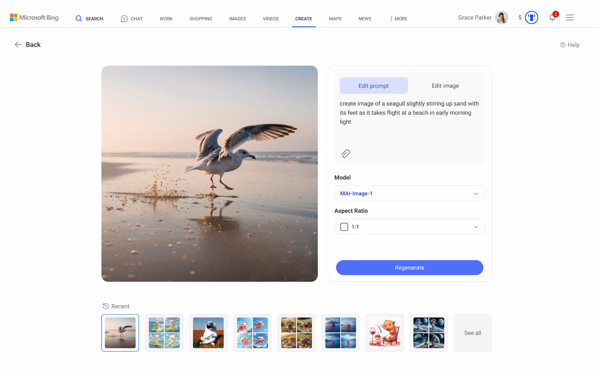 - If you select MAI-Image-I, hitting the "Create" button will generate 1 image based on your prompt.