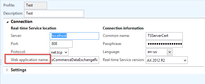 Solution: This is almost always caused by a mismatch between the “Web application name” setting on the Real-time Service profile and the actual application itself. In my example I intentionally misspelled it; usually when this error pops up I see people using the Web site itself (CommerceDataExchangeRealtimeServiceWebsite) instead of the application (CommerceDataExchangeRealtimeService). Double check those two and make sure they’re exactly the same.