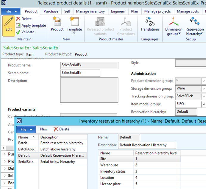 Because the sales serial number tracking is not done at the inventory transaction level the released product will not use a reservation hierarchy with serial number tracking. For this blog post example, a new product is created using an Inventory reservation hierarchy as shown below: