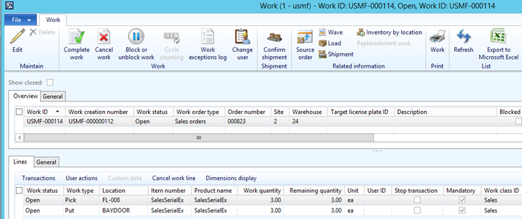 A sales order line has been created for the quantity of 3 and released to the warehouse and work has been created.