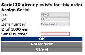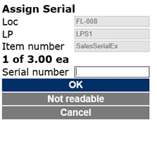 When processing the work, the mobile device will prompt for identification of each of the sales serial numbers because of the Capture serial set to “Picking” on the Tracking dimension group.