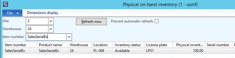 For this blog post example, a license plate of the quantity of 100 of the product has been received and put-away into the warehouse and the serial number dimension is not part of the inventory on-hand:
