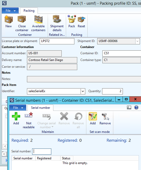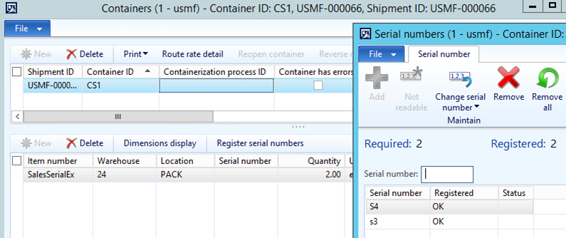 Validation is run ensuring the correct quantity of unique sales serial numbers gets registered during the packing operation and it is possible to view and maintain the recorded serial numbers from the Containers form.