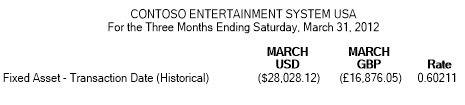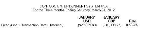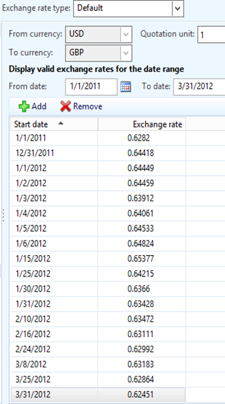 Rates entered in AX for USD to GBP that will be used by MR when doing currency translation.