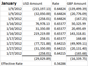 The report date is March 31st. The columns are set to return January data. Below is a screen shot of the report followed by the transactions that exist within January. The effective rate calculates to .56286.