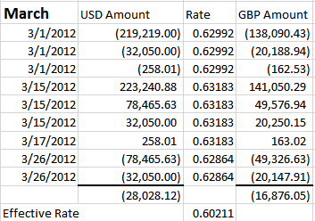 The report date is March 31st. The columns are set to return March data. Below is a screen shot of the report followed by the transactions that exist within March. The effective rate calculates to .60211.
