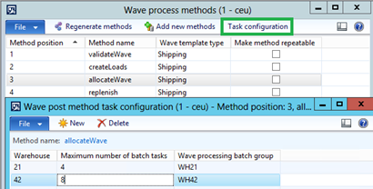 A new button called Task configuration is enabled for the allocateWave method. This buttons opens the Wave post method task configuration form.