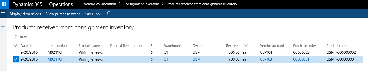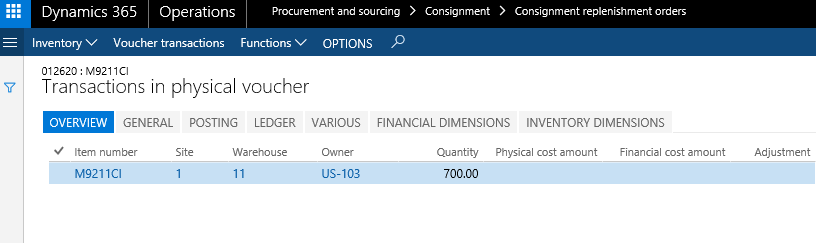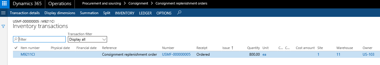 As for the purchase order, the consignment replenishment order lines will create expected inventory transactions and the owner dimension value will automatically be assigned based on the linked value related to the vendor account.