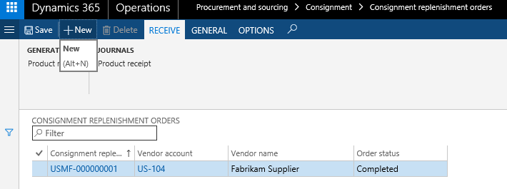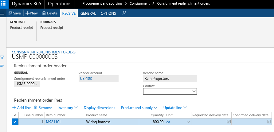 - Create a consignment replenishment order header and line to record and process inbound vendor-owned inventory.