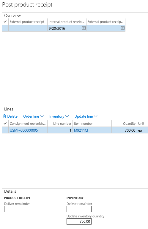 To get the order and inventory transactions into the final state, run the Product receipt update from the consignment replenishment order.