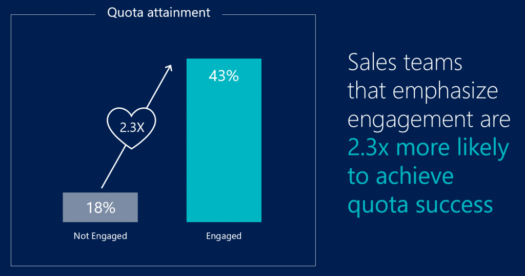 Our latest research shows that greater engagement is directly correlated to revenue achievement. Specifically, sales teams that emphasize engagement are 2.3 times more likely to achieve quota success compared to those who do not emphasize engagement.