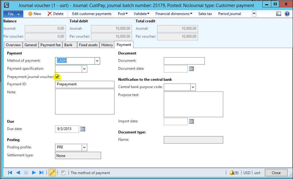 Select the Payment tab and mark the “Prepayment journal voucher” box