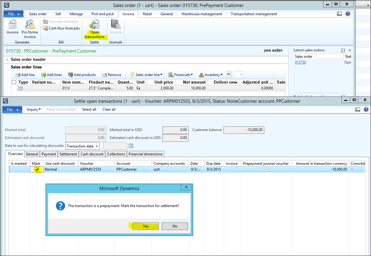 To link the Prepayment, click the Invoice tab > Settle > Open transactions and Mark the box next to the Prepayment. Click Yes when you receive the message that the transaction is a prepayment.