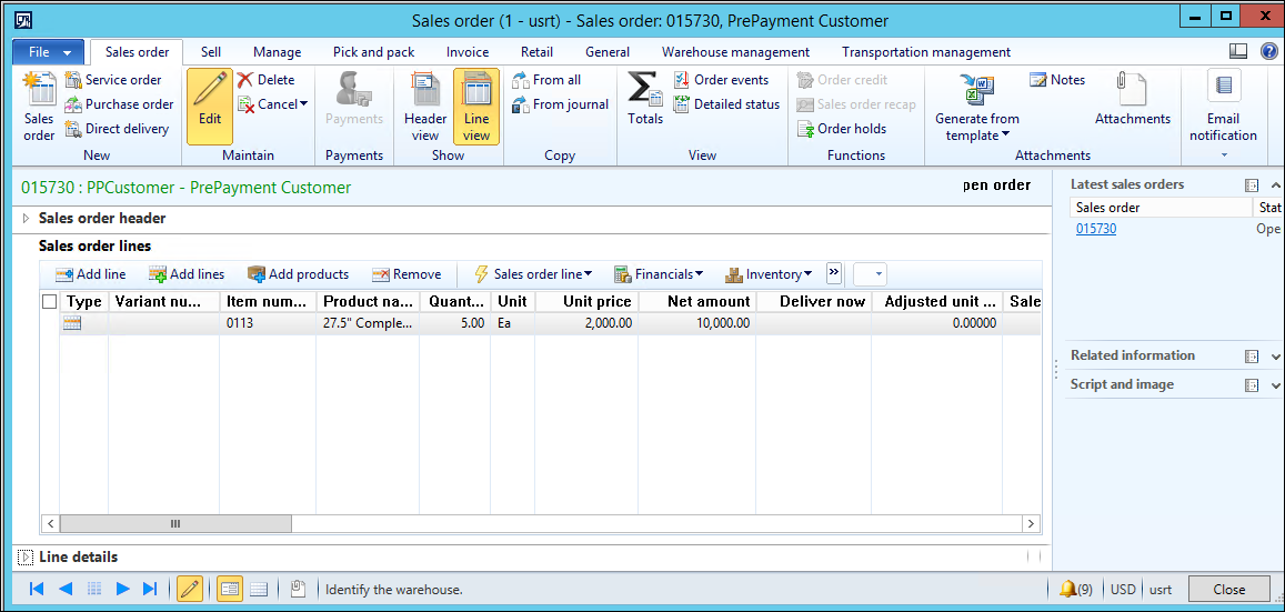 2. Create a Sales order and link the Prepayment