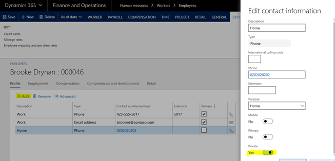 In Dynamics 365 for Finance and Operations you can select contact information on a worker to be private: