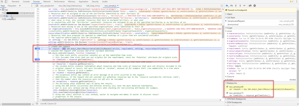 - Open the browser’s developer tools by using the F12 function key. Set breakpoints as needed and inspect the request/responses in the developer tool’s console.