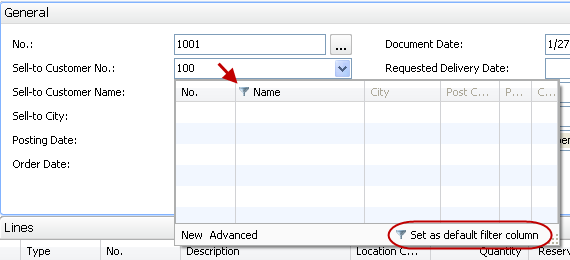 Now, as you type in the Sell-to Customer No. field, the filter is set to look in the Name column rather than the No. column.