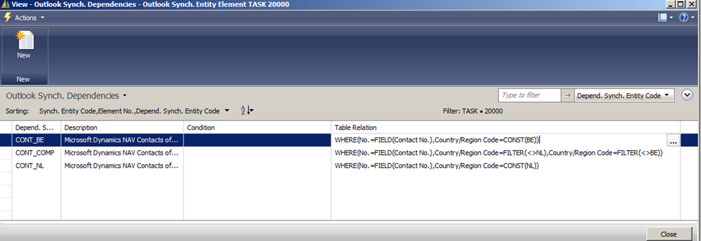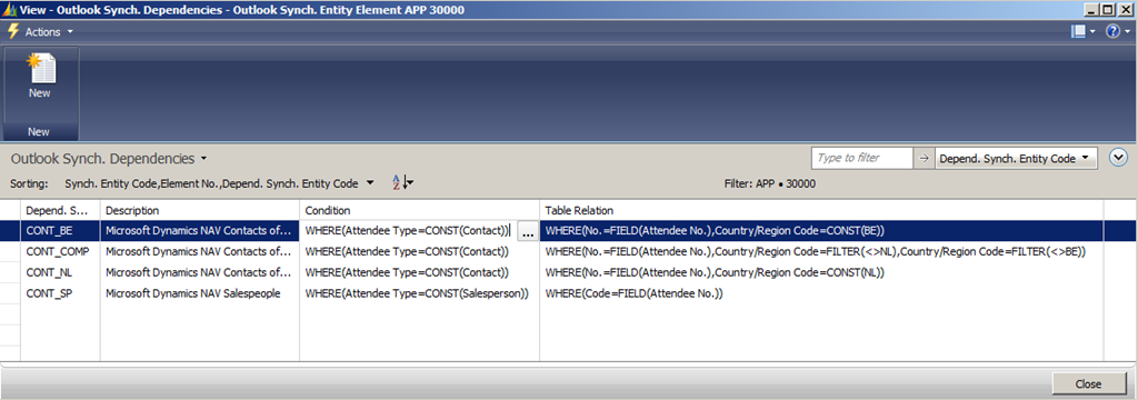The scenario is as follows. We want to split the Dynamics NAV contacts of person type in Belgium ones and Dutch ones. We first delete the CONT_PERS entity. To do so, start up RTC and select CRONUS International Ltd./Departments/Administration/Application Setup/Microsoft Office Outlook Integration/Outlook Synch. User Setup. Manually select all lines and either press CTRL+DEL or right click and select Delete. Second step is to delete the CONT_PERS entity. To do so, follow these steps. In RTC, select CRONUS International Ltd./Departments/Administration/Application Setup/Microsoft Office Outlook Integration/Outlook Synch. Entities, select CONT_SP and press CTRL+SHIFT+E or right click the entity and select Delete. Confirm the deletion that collections will be updated automatically.