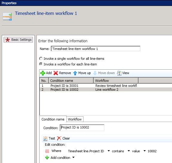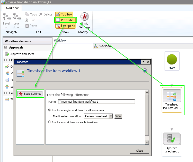 3. Configure the workflow structure like in previous step, but note the new element Timesheet line-item workflow. Add this element to the workflow processing and open its properties.