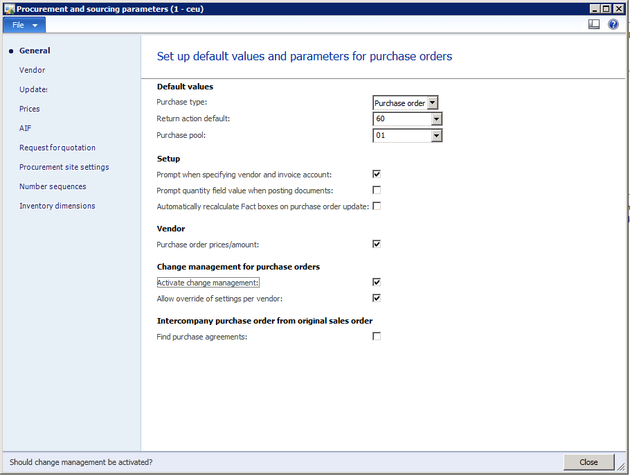Active change management is a Procurement and sourcing parameter that controls the enforcement of purchase order workflows. With Active change management enabled purchase orders will require workflow approval before the order can be confirmed.