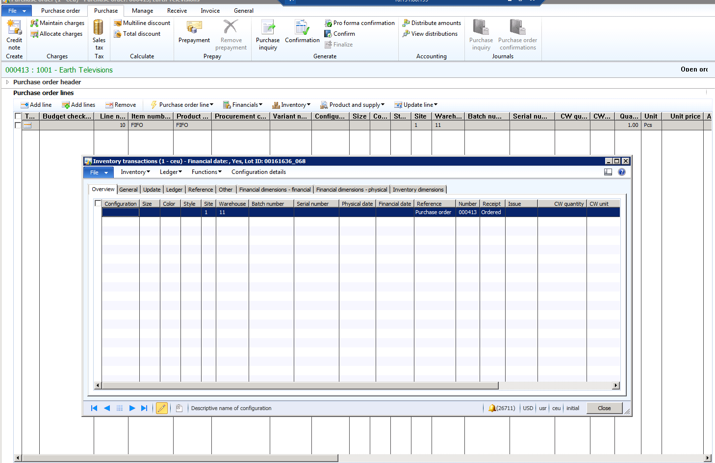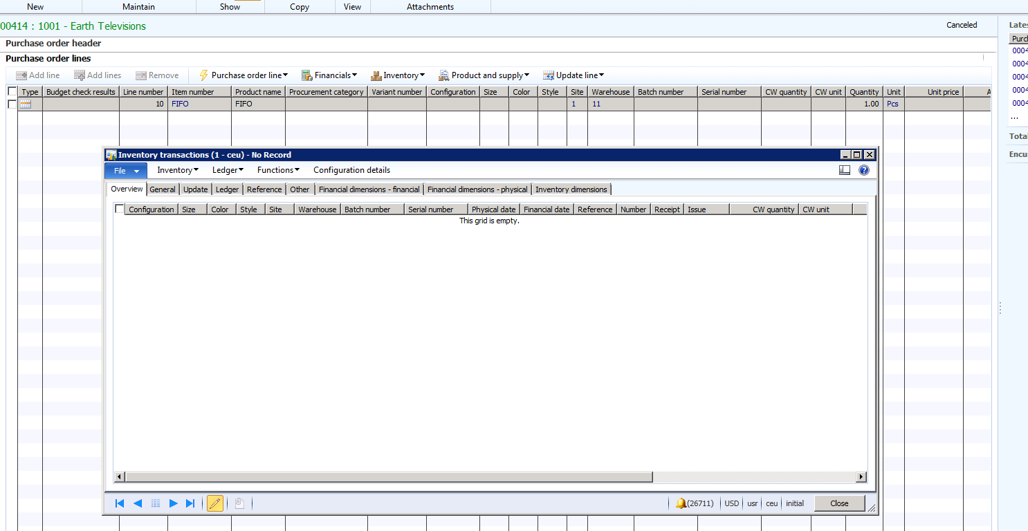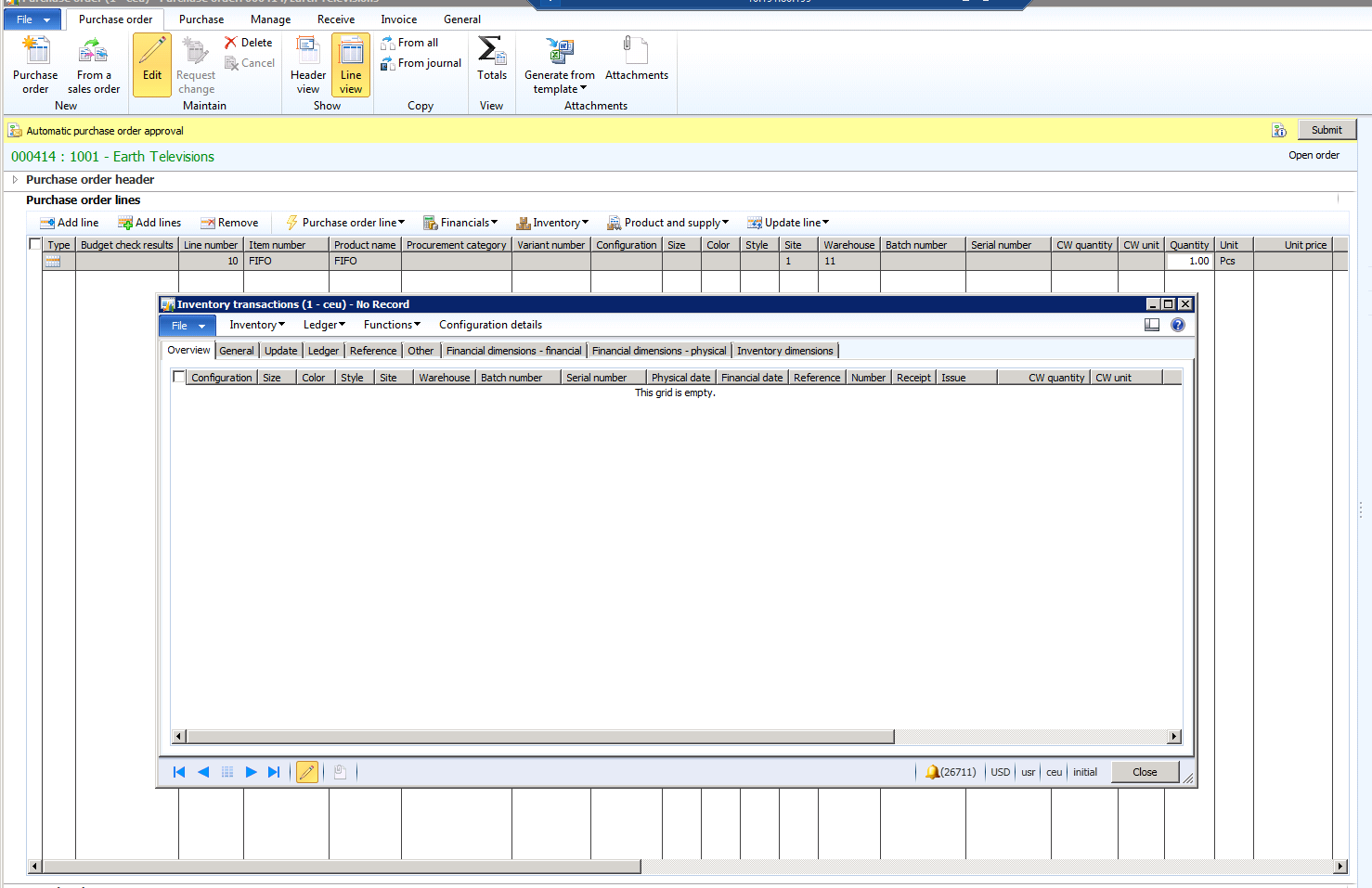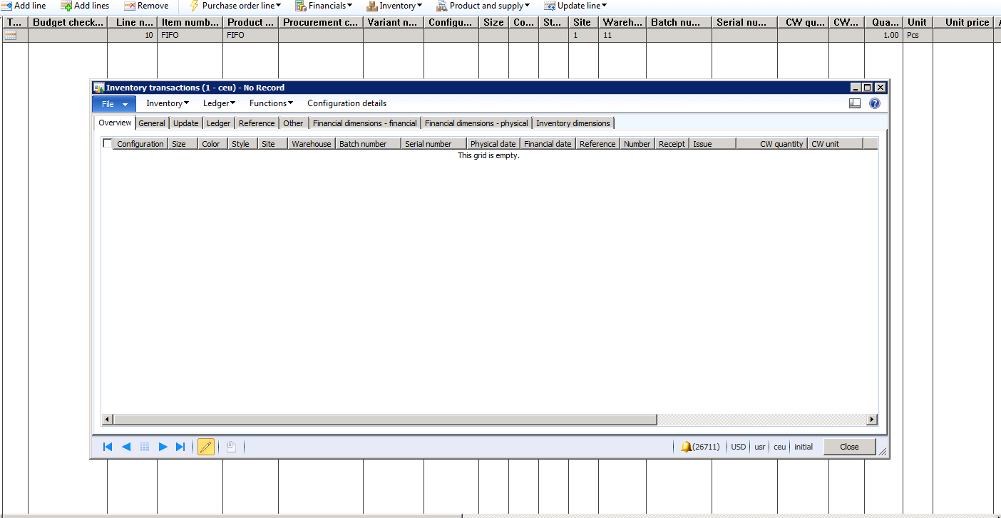 If the same situations occur when Active change management is enabled the results will different. The purchase order below is identical to the purchase order as above, but Active change management is enabled. When I add the FIFO product to the order the inventory transactions are not created.
