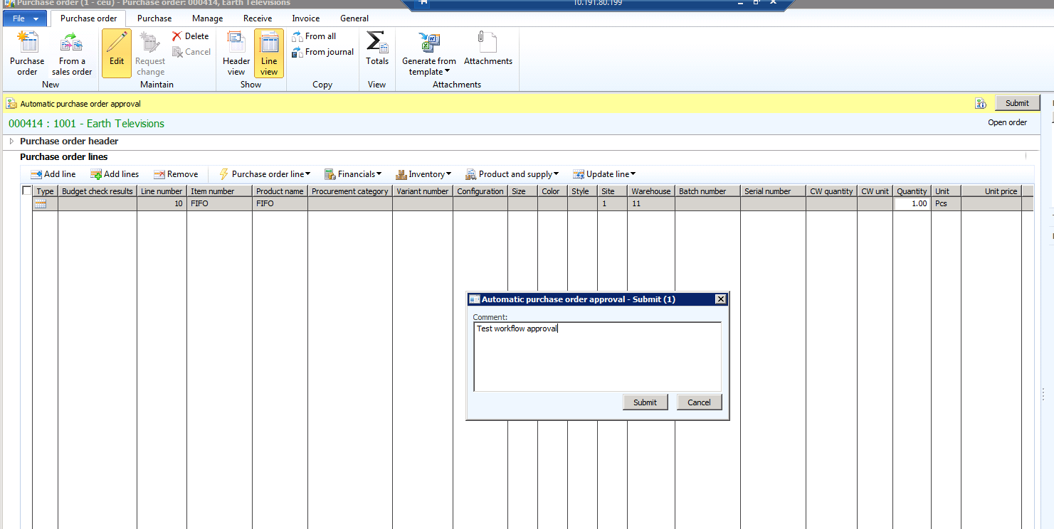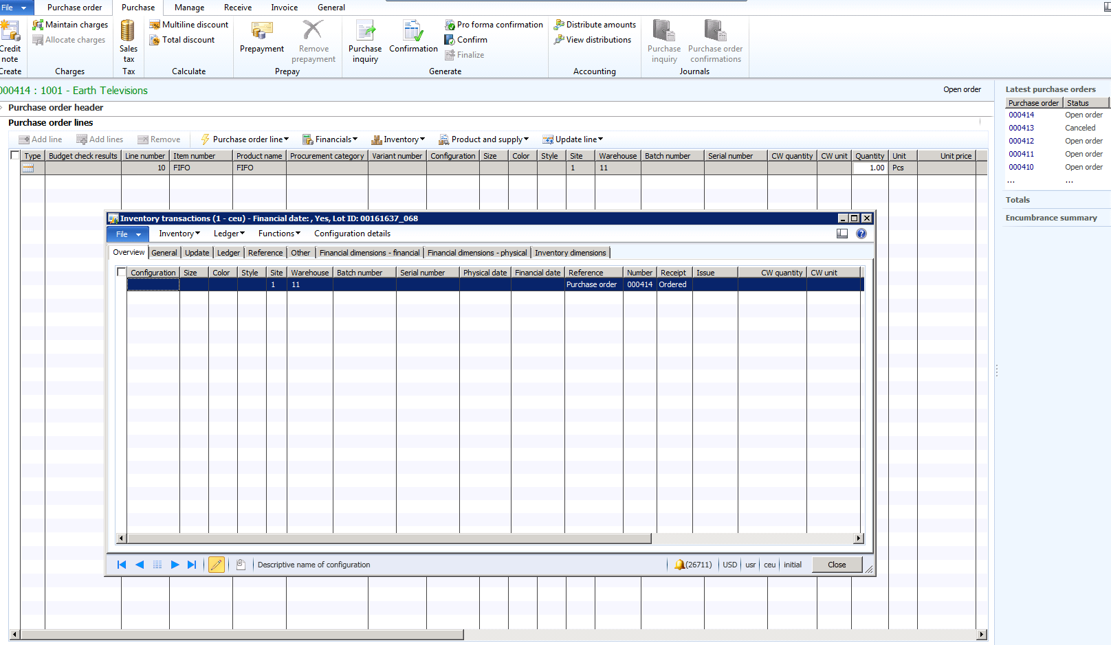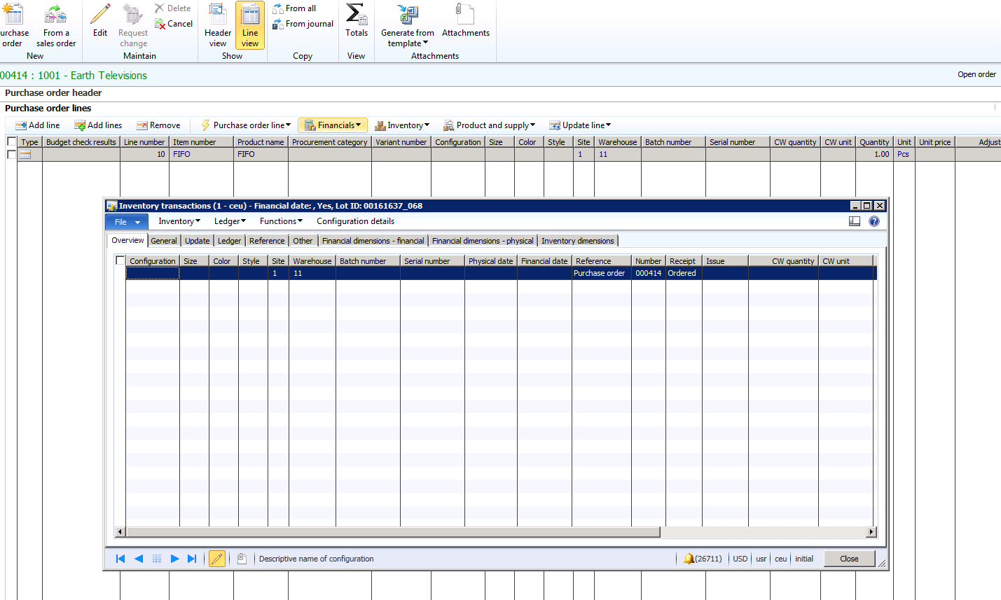 If the same situations occur when Active change management is enabled the results will different. The purchase order below is identical to the purchase order as above, but Active change management is enabled. When I add the FIFO product to the order the inventory transactions are not created.