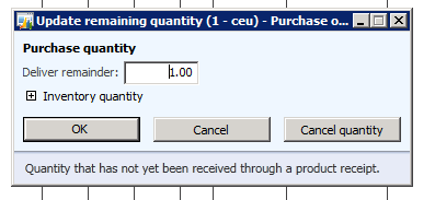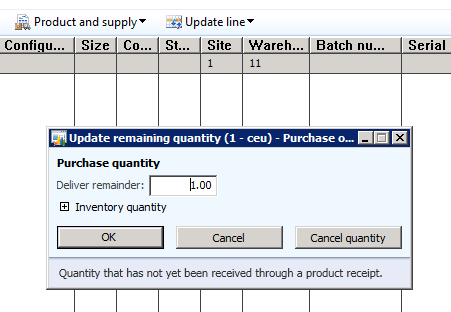 Active change management also affects the cancellation of expected inventory. Unlike the example above when the delivery remainder quantity is cancelled (Update line > Delivery remainder > Cancel quantity) the inventory transactions are not removed.