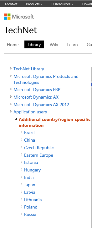 This country/region-specific content can be found in our table of contents at the following location: TechNet library > Microsoft Dynamics Products and Technologies > Microsoft Dynamics ERP > Microsoft Dynamics AX > Microsoft Dynamics AX 2012 > Application users > Additional country/region-specific information