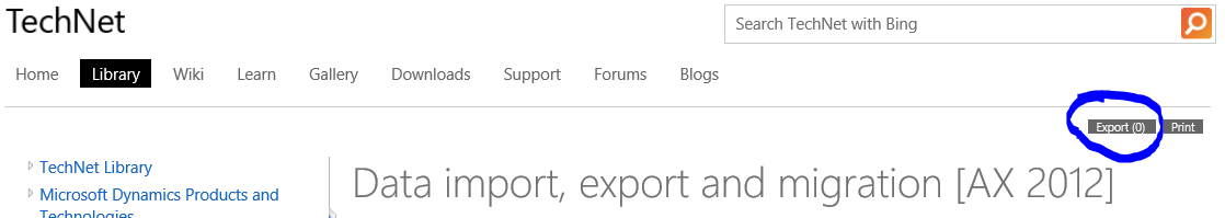 - Navigate to Master Data Management in the AX documentation set, click Export, and the set of pages.