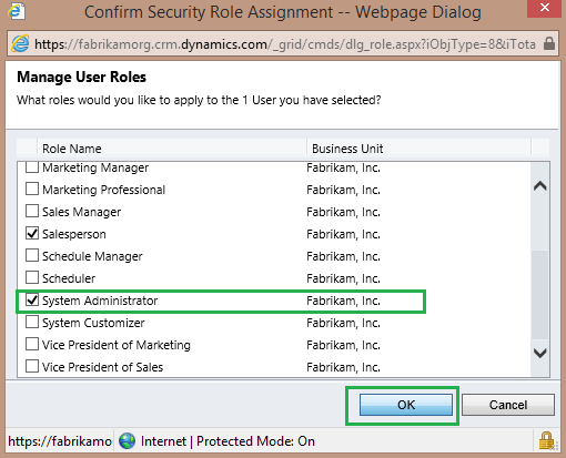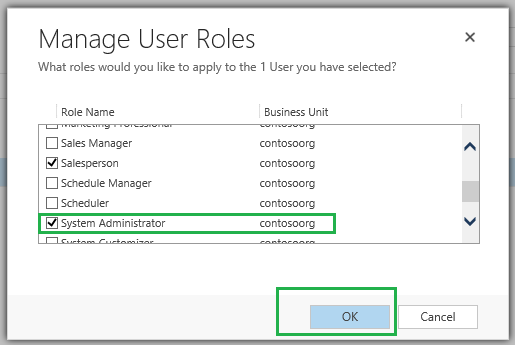 Step 6: On the Manage User Roles page, you will find all of the assigned roles for the selected user(s). Scroll down till you find the System Administrator role, select the role by checking the box next to the role, then click OK button to save your changes