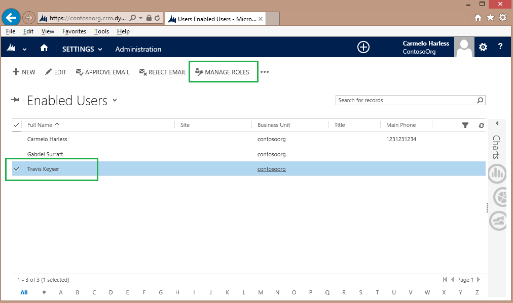 Ensure the user (Travis) is selected and then click Manage Roles on the Enabled Users toolbar