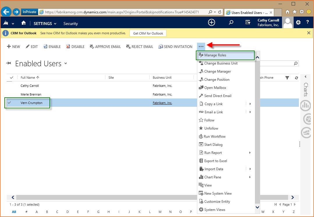 Ensure the user (Vern) is selected and then click Manage Roles on the Enabled Users toolbar