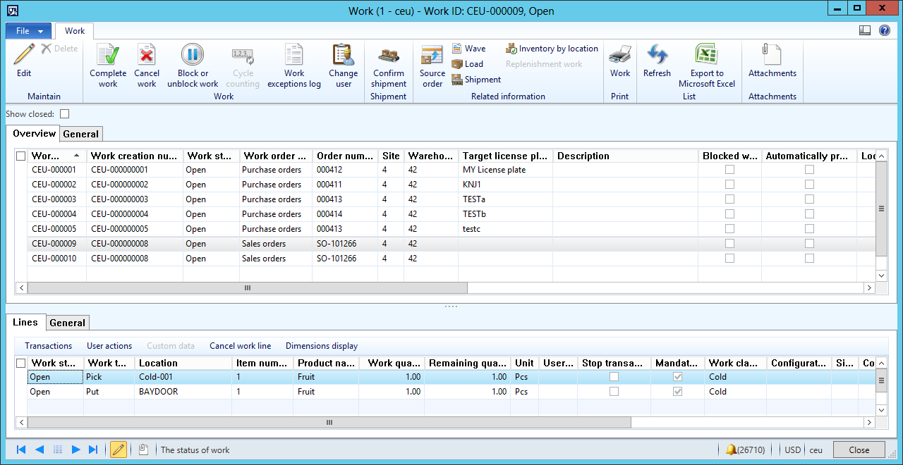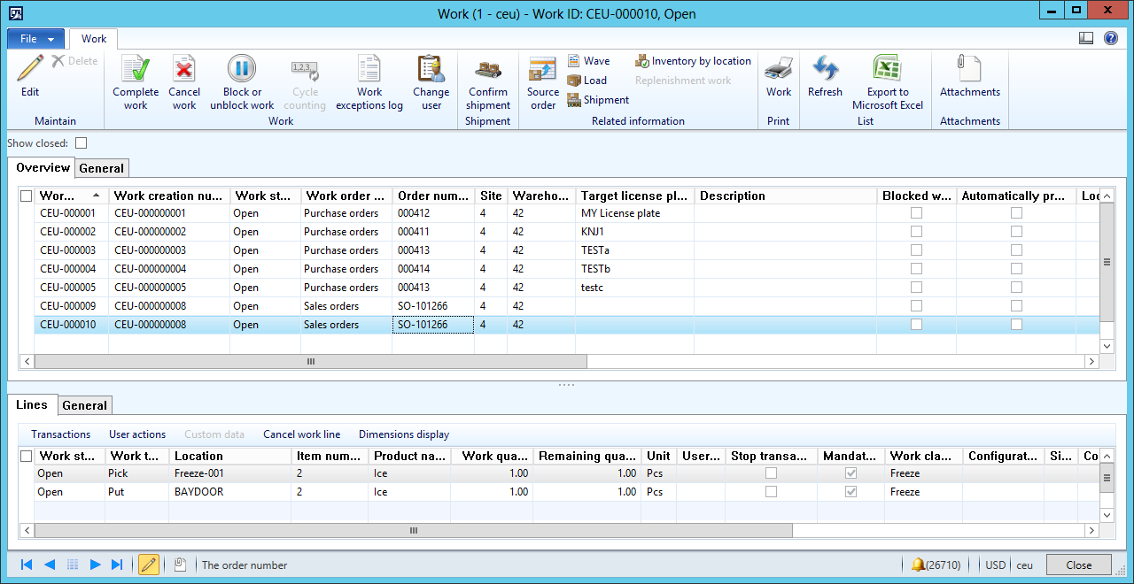 Work is created when the sales order is released to warehouse. With the setup we have just made, the result is two work orders.