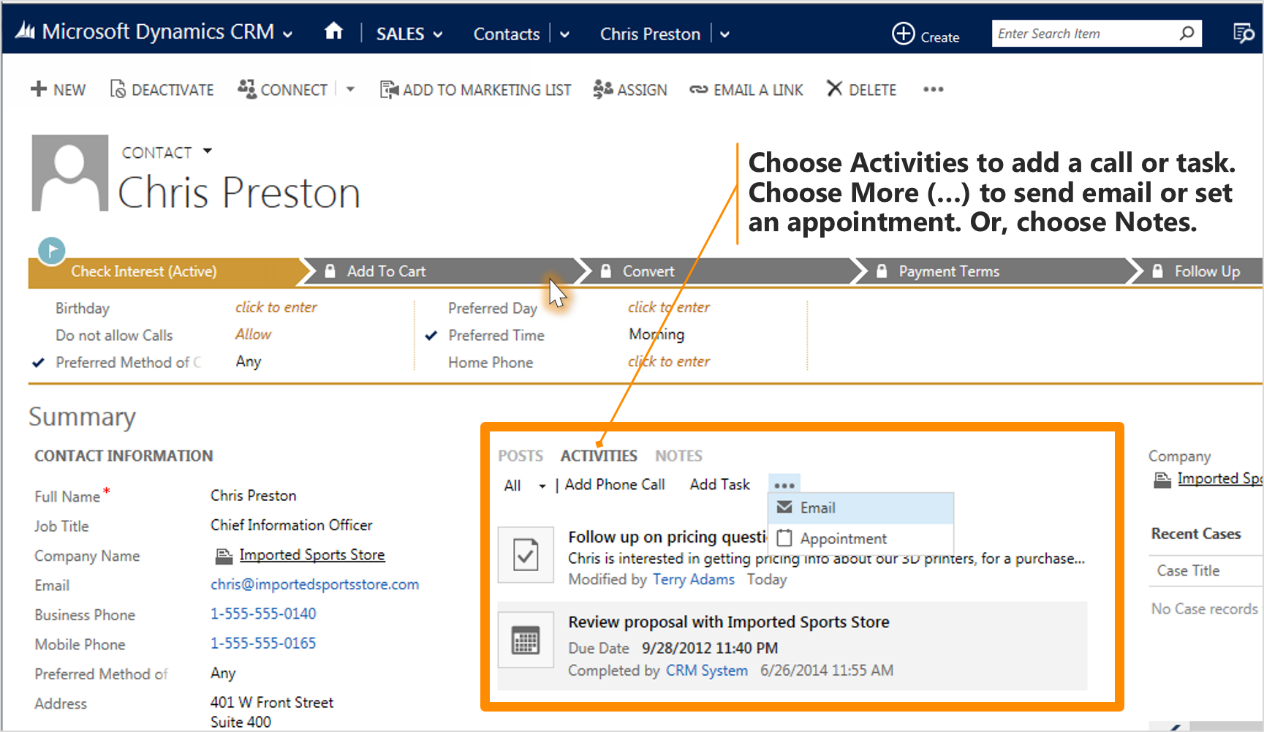 4. Keep in mind that activities “roll up” under their associated records. Let’s say you want to remind yourself to follow up with Chris Preston, a contact who’s associated with the account, Imported Sports. You’ll need to add the task activity to the contact record for Chris (not for the account, Imported Sports).