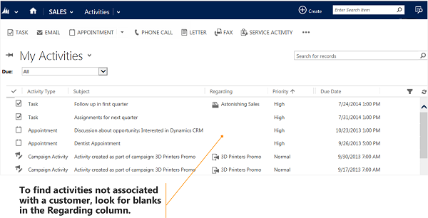 3. Add activities for yourself, too. You can keep track of your own assignments, events, and notes without associating these activities with a customer record. Use the Create command, which is available on the nav bar from anywhere in the system. Find your own activities in the list by sorting on the Regarding column, which will be blank to let you know that the activity isn’t associated with a customer record.