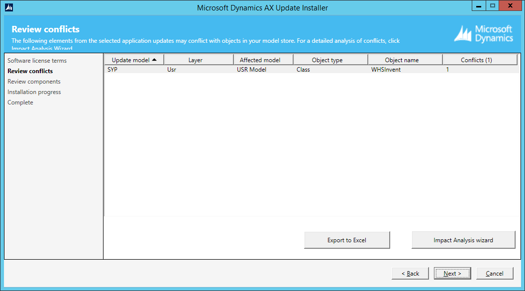 You can again review conflicts and run through the Impact analysis wizard (similar to the experience in the Update installer).