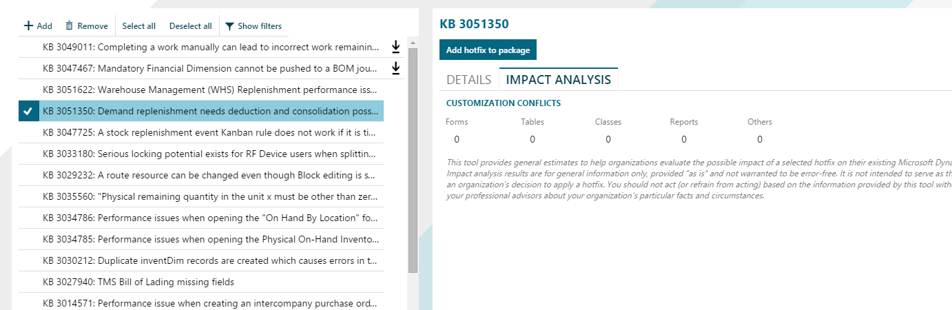 You can select an update and click the Impact analysis tab to see the impact of each hotfix on your customizations. For example, if a class has been customized in your environment and if a hotfix affects that class, one class is listed as impacted.
