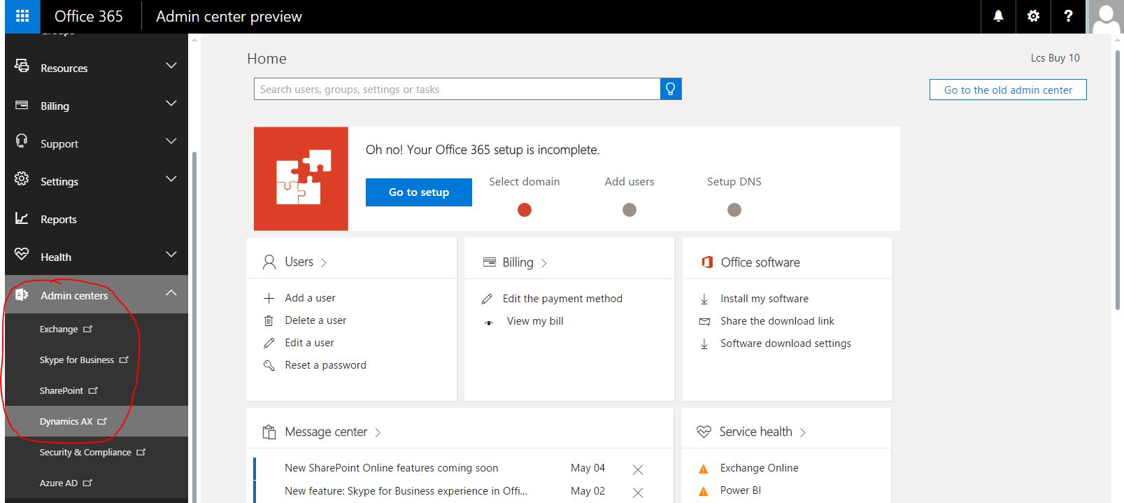 Alternatively, you can go to https://portal.office.com and click on Admin centers -> Dynamics AX to “Get started” with Dynamics AX.