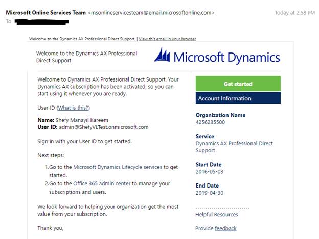Once the service is ready for use you will receive a confirmation that Dynamics AX subscription has been activated and you can