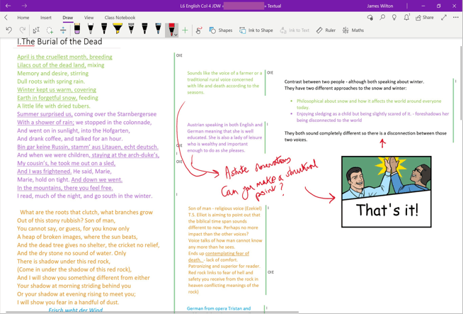 In the second year of my OneNote experiment, I was given a ‘top set’ Year 11 (second year of GCSE)—a high-ability group with whom I could afford even more latitude to experiment with ‘flipped’ learning styles in preparing them for their Literature GCSE exam. I began to do less curating of material in the Content Library and started to ask them to generate their own resources. I scaffolded annotation tasks in the Collaboration Space and had them collaborate on PowerPoint or Word docs (shared from OneDrive). They would then copy and paste them into the Content Library pages, which effectively gave the students a repository of shared research and note-taking experience.