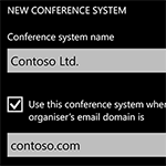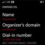 Join via voice by speaking to Cortana “JOIN MY CONFERENCE”. We’ll automatically figure out which meeting is about to start and what conference system it uses, then connect you in the right way. Join Conference should work with all conference systems, whatever your company might use. For most systems, it dials the appropriate phone number, ID, and PIN touch tones. For Lync and GoToMeeting conferences it launches the associated app to join.