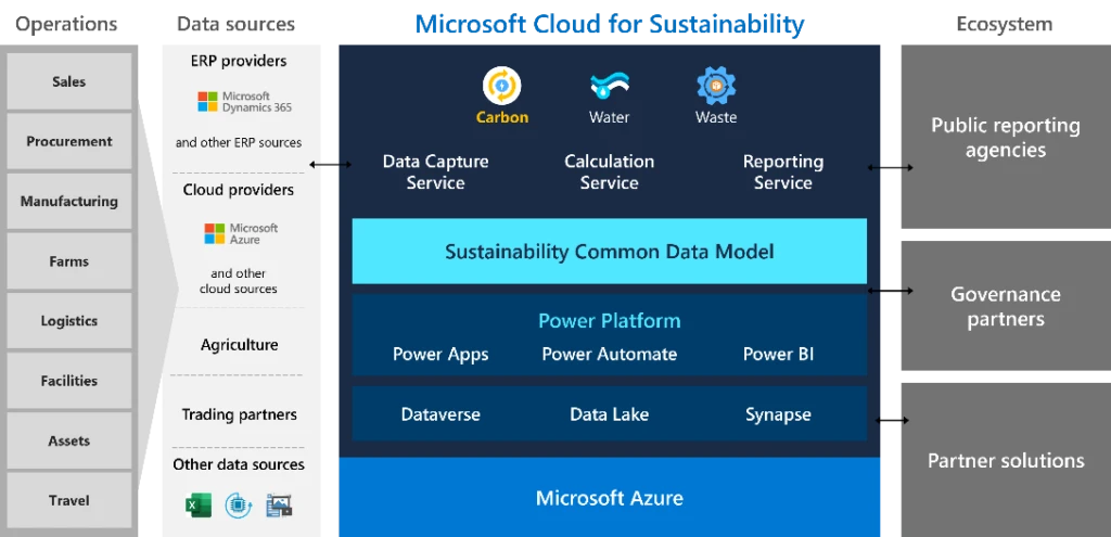 Data is captured from operational sources within an organization and up and down the value chain, including ERP applications, energy providers, other third-party industry partners, and many others. The data is integrated and visualized by the solution and reported to regulatory agencies. Partner solution connectors extend Microsoft Cloud for Sustainability, tailoring for industry and region-specific needs and bringing greater accuracy.