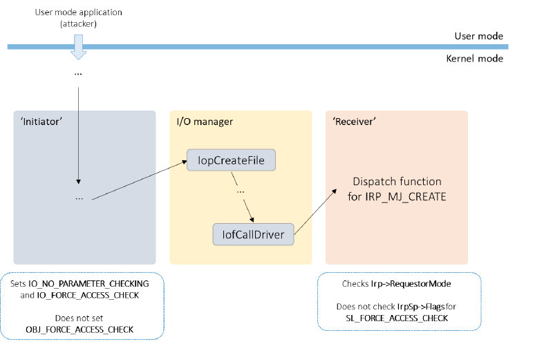 in deciding whether to perform an access check, an IRP_MJ_CREATE handler must not only check if the IRP’s RequestorMode is UserMode or not, but also check if the SL_FORCE_ACCESS_CHECK flag is set