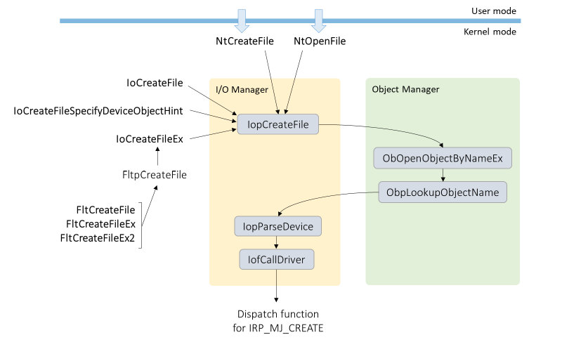 When a user mode application creates or opens a file, this causes a system call to be made to NtCreateFile or NtOpenFile. Kernel mode code has an broader set of API functions to choose from: NtCreateFile/NtOpenFile and their Zw-prefixed equivalents, the IoCreateFile* functions from the I/O Manager, and the FltCreateFile* functions from the Filter Manager.