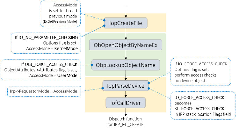 As illustrated in the diagram above, all of these end up at the I/O Manager internal function IopCreateFile. The thread’s PreviousMode is assigned to a variable AccessMode, which in IopCreateFile is used to decide whether or not to check for valid parameters and buffers, before being passed to the Object Manager in a call to ObOpenObjectByNameEx. Later, in IopParseDevice, the AccessMode is used in access checking – if it is UserMode, then a privilege check is performed on the device object. Next, IopParseDevice constructs an I/O Request Packet (IRP), sets its RequestorMode field to the AccessMode, and uses IofCallDriver to pass control to the IRP_MJ_CREATE dispatch function of the device.