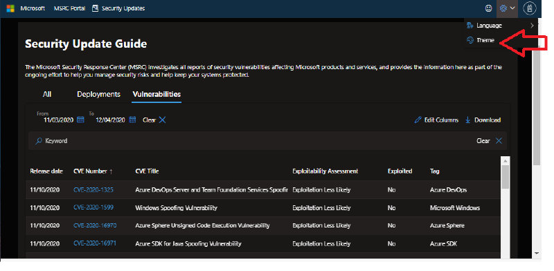 3. The Vulnerabilities tab on the new Security Update Guide shows you a list of CVEs, and you can choose what columns you want to see!